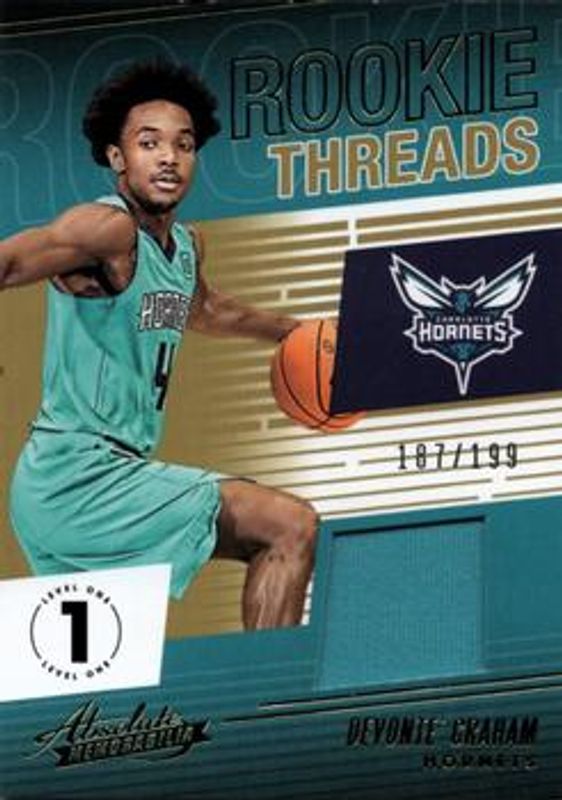 The Devonte' Graham 2018 Absolute Memorabilia #RT-DGR Rookie Threads /199 card is 1 of 18 Devonte' Graham's card variations in the 2018 Absolute Memorabilia set being tracked by Sports Card Investor, including Base, 10th Anniversary /10, Maroon /7, Rookie Threads Level 2 /149, and Hoopla Signatures /125.