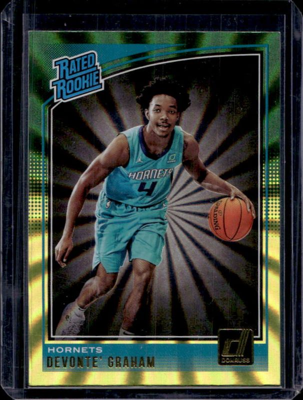 The Devonte' Graham 2018 Donruss #189 Green & Yellow Laser Rookie card is 1 of 29 Devonte' Graham's card variations in the 2018 Donruss set being tracked by Sports Card Investor, including Base, Green Flood, Orange Laser, Yellow Flood, and Press Proof Silver /349.