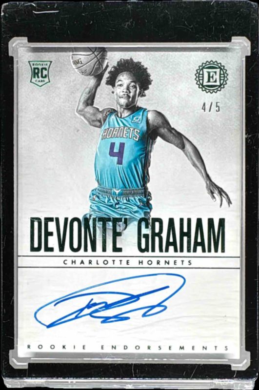 The Devonte' Graham 2018 Encased #129 Green /5 Rookie card is 1 of 19 Devonte' Graham's card variations in the 2018 Encased set being tracked by Sports Card Investor, including #129 Base /99, #218 Base /99, #187 Base /99, #218 Red /25, and #187 Red /25.