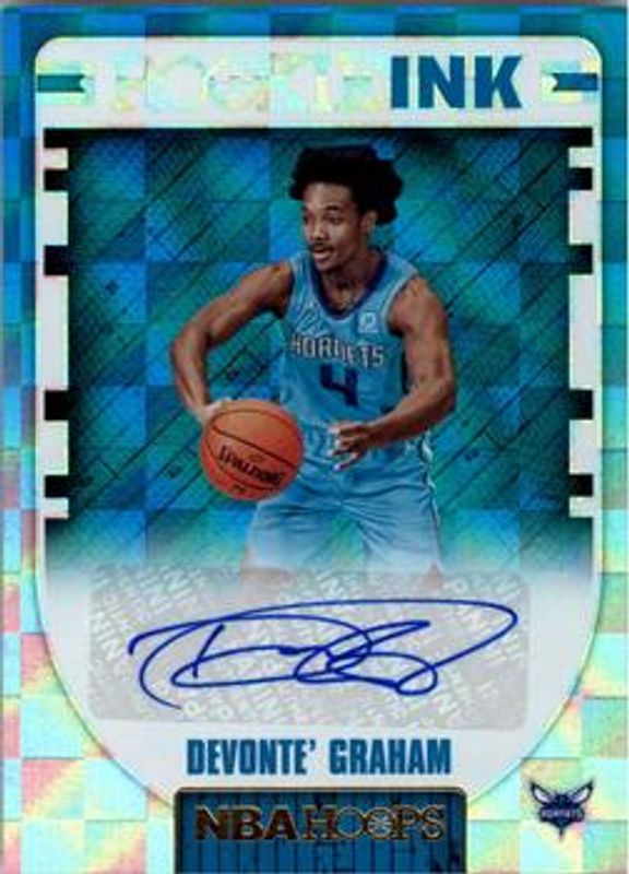 The Devonte' Graham 2018 Hoops #RI-DG Rookie Ink card is 1 of 24 Devonte' Graham's card variations in the 2018 Hoops set being tracked by Sports Card Investor, including Base, Red Backs, Premium Box Set /199, Blue, and Hot Signatures Rookies.