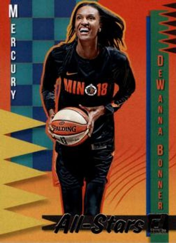 The DeWanna Bonner 2019 Donruss WNBA #18 All Stars card is 1 of 19 DeWanna Bonner's card variations in the 2019 Donruss WNBA set being tracked by Sports Card Investor, including Base, Optic, Optic Holo, Silver Press Proof /199, and Purple Press Proof /99.