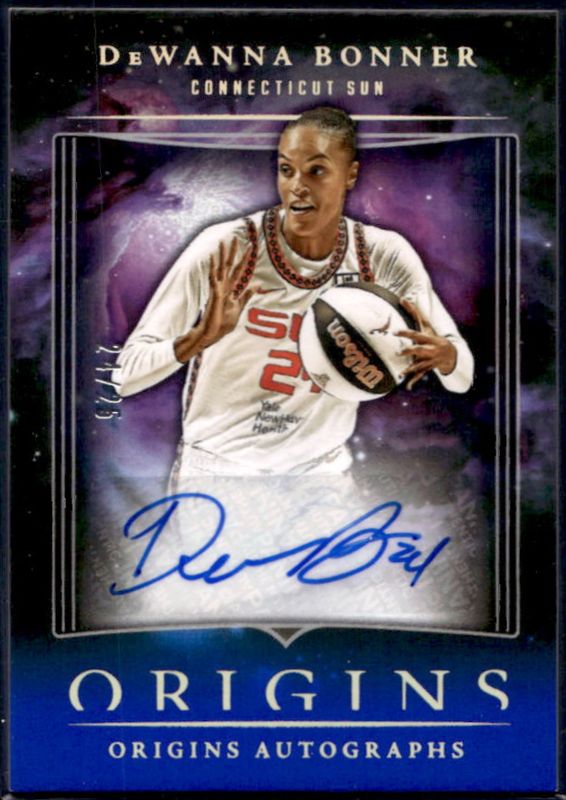 The DeWanna Bonner 2024 Origins WNBA #OA-DB Origins Autographs - Blue /25 card is 1 of 17 DeWanna Bonner's card variations in the 2024 Origins WNBA set being tracked by Sports Card Investor, including Base, Red /99, Blue /75, Swirl /(SSP), and Teal /49.