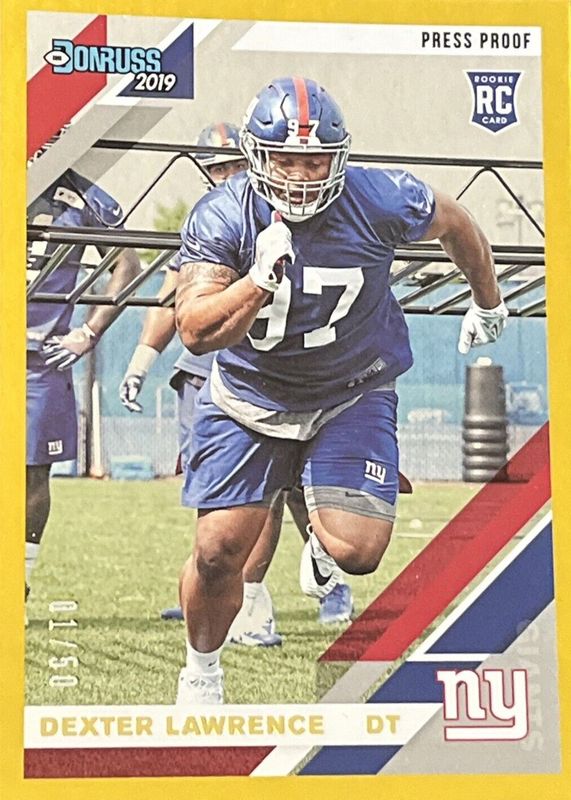 This card is 1 of 15 Dexter Lawrence's card variations in the 2019 Donruss set being tracked by Sports Card Investor, including Base, Aqueous Test, Jersey Number (/97), Press Proof Blue, and Press Proof Bronze.