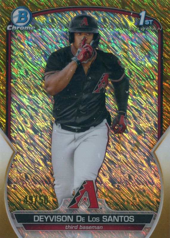 The Deyvison De Los Santos 2023 Bowman #BCP-116 Chrome Prospects - Gold Shimmer Refractor /50 (1st) card in Raw condition has not changed in price in the last 30 days and was last sold for $83.00 .