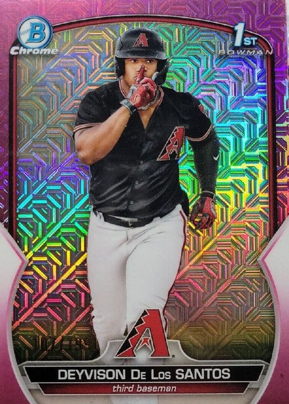 Best Prices Available For Sale of Deyvison De Los Santos 2023 Bowman Mega Box #BCP-116 Chrome Prospects - Pink Mojo Refractor /199 (1st)