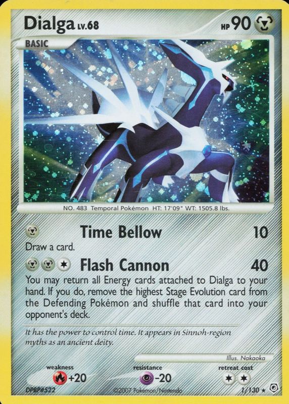 The Dialga 2007 Diamond & Pearl #001/130 Holo card in Raw TCG (Near Mint) condition has moved down -$1.55 (-10.7%) in the last 30 days and was last sold for $13.00 .