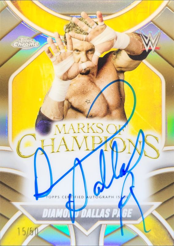 The Diamond Dallas Page 2025 Topps Chrome WWE #MOC-DD Marks of Champions Autographs - Gold Refractor /50 card is 1 of 24 Diamond Dallas Page's card variations in the 2025 Topps Chrome WWE set being tracked by Sports Card Investor, including Allen & Ginter, Allen & Ginter - Refractor, Embedded, Marks of Champions Autographs, and Marks of Champions Autographs - Refractor /175.