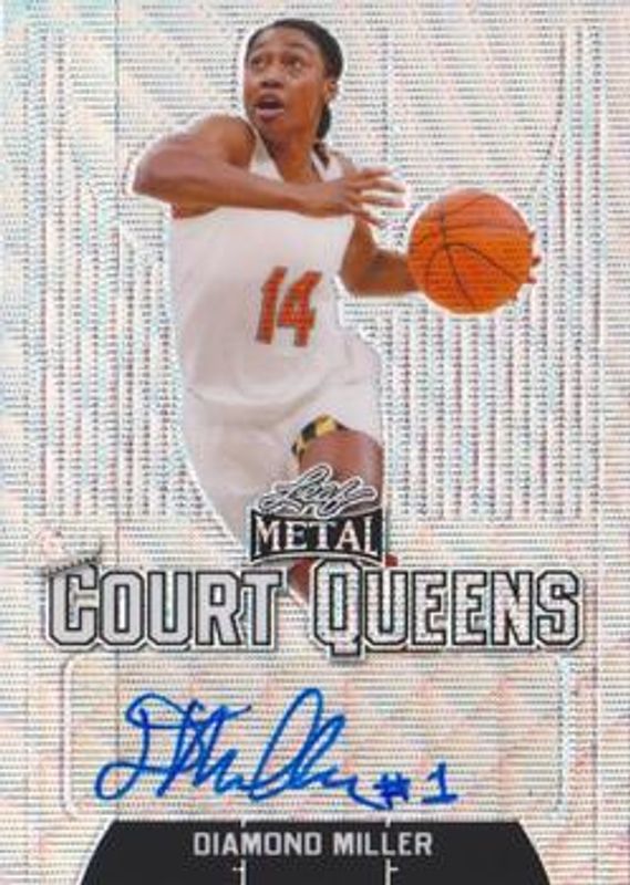 The Diamond Miller 2021 Leaf Metal #CQ-DM1 Court Queens Autographs - Silver Wave card is 1 of 88 Diamond Miller's card variations in the 2021 Leaf Metal set being tracked by Sports Card Investor, including Base, Silver Crystal, Silver Mojo, Silver Wave, and Blue Rainbow /50.