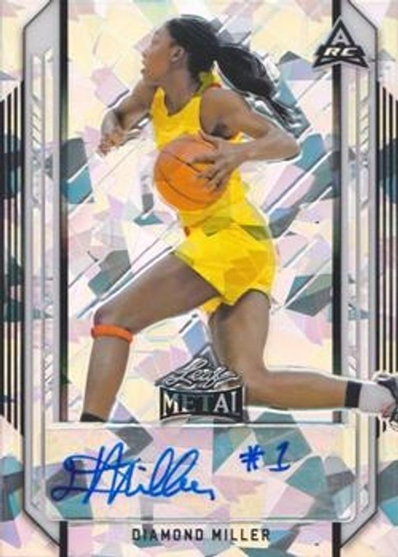 The Diamond Miller 2021 Leaf Metal #BA-DM2 Silver Crystal card is 1 of 88 Diamond Miller's card variations in the 2021 Leaf Metal set being tracked by Sports Card Investor, including Base, Silver Mojo, Silver Wave, Blue Rainbow /50, and Blue Wave /30.