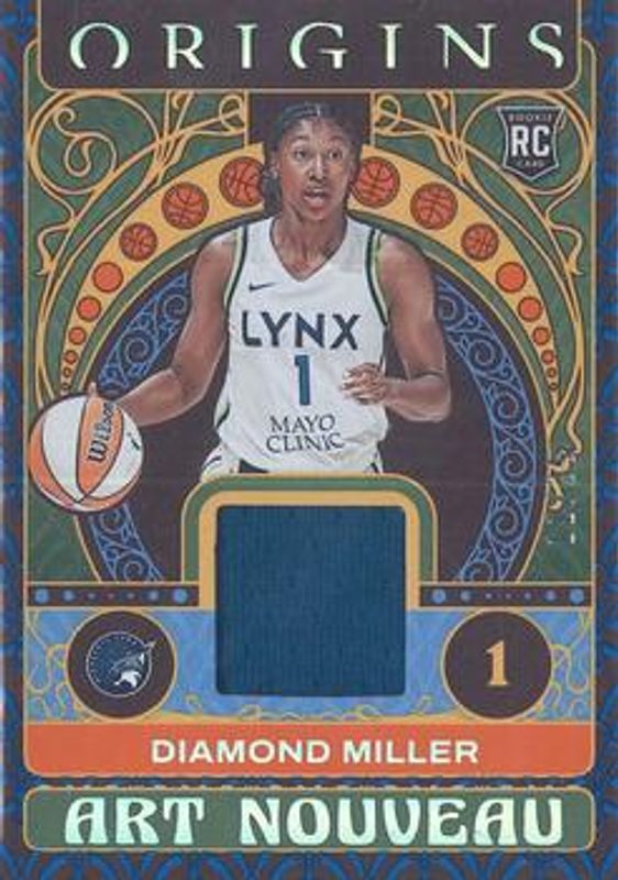 The Diamond Miller 2023 Origins WNBA #AN-DML Art Nouveau Memorabilia - Blue /25 card is 1 of 33 Diamond Miller's card variations in the 2023 Origins WNBA set being tracked by Sports Card Investor, including Base, Rainbow, Red, Blue /75, and Teal /35.