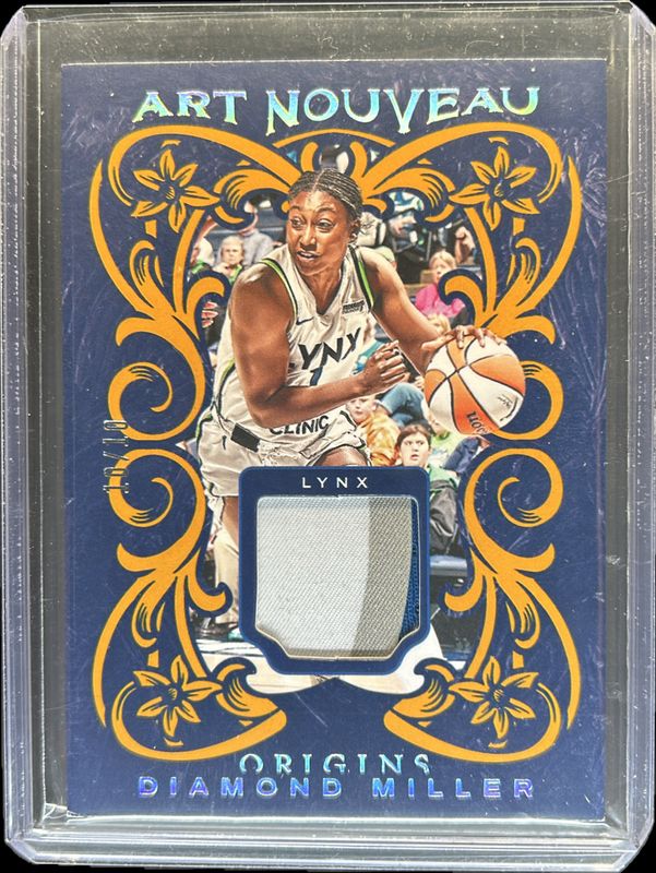 The Diamond Miller 2024 Origins WNBA #AN-DM Art Nouveau Memorabilia - Gold /10 Rookie card is 1 of 17 Diamond Miller's card variations in the 2024 Origins WNBA set being tracked by Sports Card Investor, including Base, Red /99, Blue /75, Swirl /(SSP), and Teal /49.