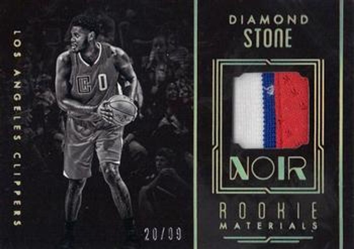 The Diamond Stone 2016 Noir #13 Rookie Materials Black & White - Prime /99 card is 1 of 12 Diamond Stone's card variations in the 2016 Noir set being tracked by Sports Card Investor, including Rookie Materials Color - Prime /99, Rookie Patch Autographs Black & - White /99, Rookie Patch Autographs Color /75, Rookie Patch Autographs Black & White - Horizontal /35, and Rookie Patch Autographs Color - Horizontal /35.