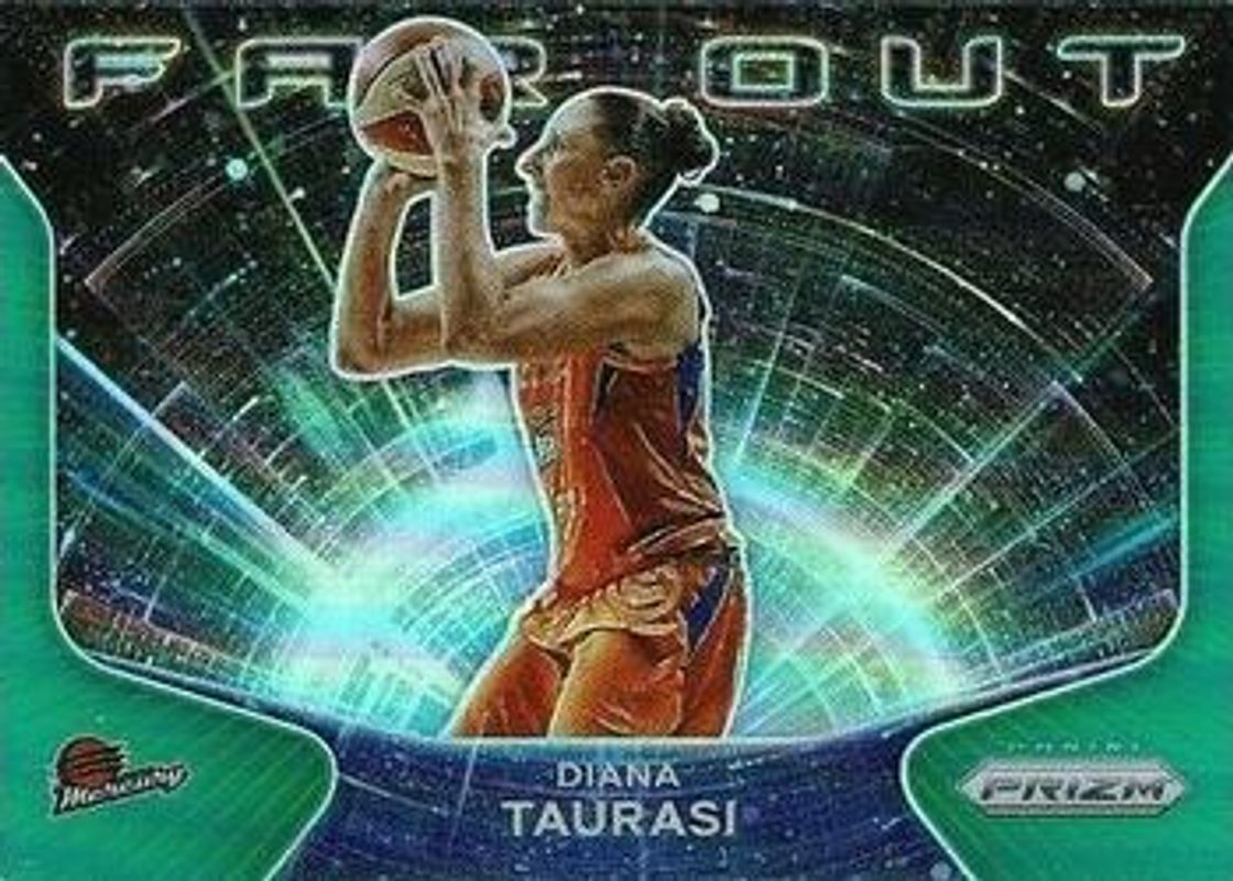 The Diana Taurasi 2021 Prizm WNBA #10 Far Out - Green card is 1 of 72 Diana Taurasi's card variations in the 2021 Prizm WNBA set being tracked by Sports Card Investor, including Base, Green, Green Ice, Hyper, and Ice.
