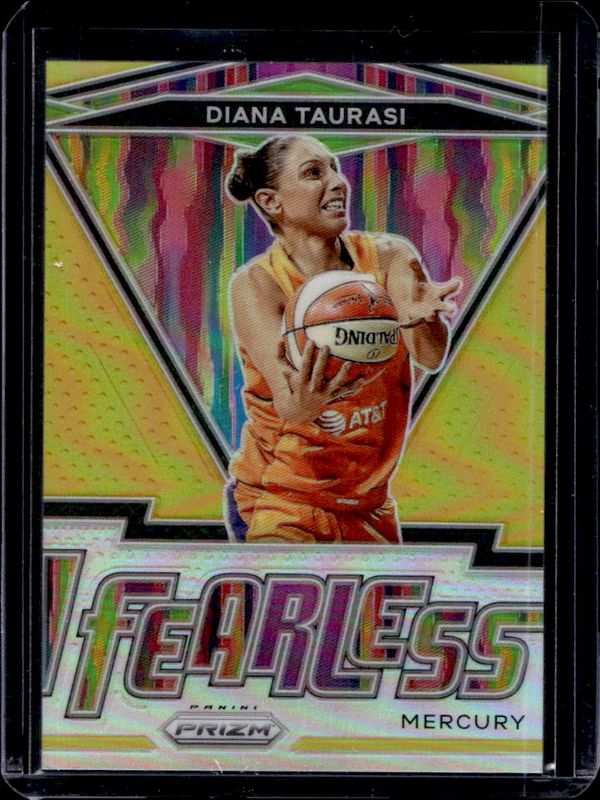 The Diana Taurasi 2021 Prizm WNBA #12 Fearless - Gold /10 card is 1 of 72 Diana Taurasi's card variations in the 2021 Prizm WNBA set being tracked by Sports Card Investor, including Base, Green, Green Ice, Hyper, and Ice.