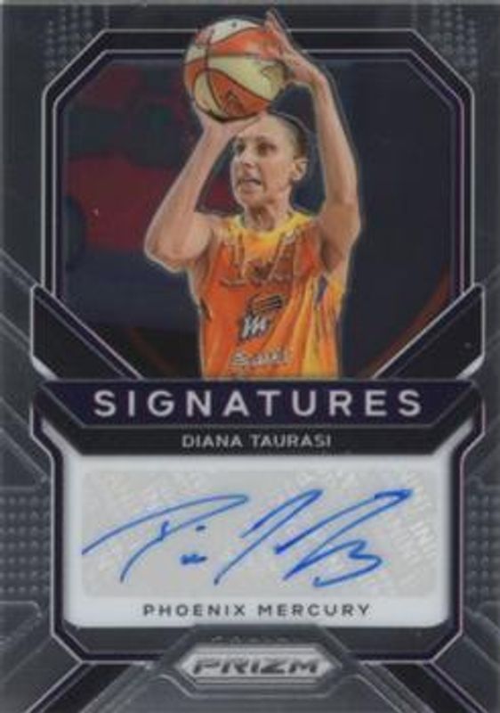 The Diana Taurasi 2021 Prizm WNBA #SG-DTS Signatures card is 1 of 72 Diana Taurasi's card variations in the 2021 Prizm WNBA set being tracked by Sports Card Investor, including Base, Green, Green Ice, Hyper, and Ice.