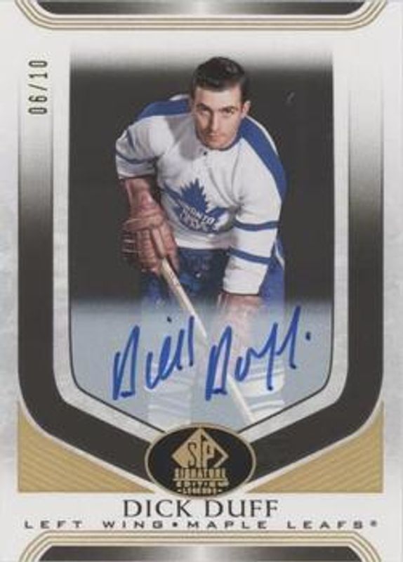The Dick Duff 2020 SP Signature Edition Legends #99 Black /10 card is 1 of 6 Dick Duff's card variations in the 2020 SP Signature Edition Legends set being tracked by Sports Card Investor, including Base /99, Gold Foil, Gold Spectrum Foil Autographs /25, 1997 Ultimate Legends The Alumni Signatures, and Silver Script.