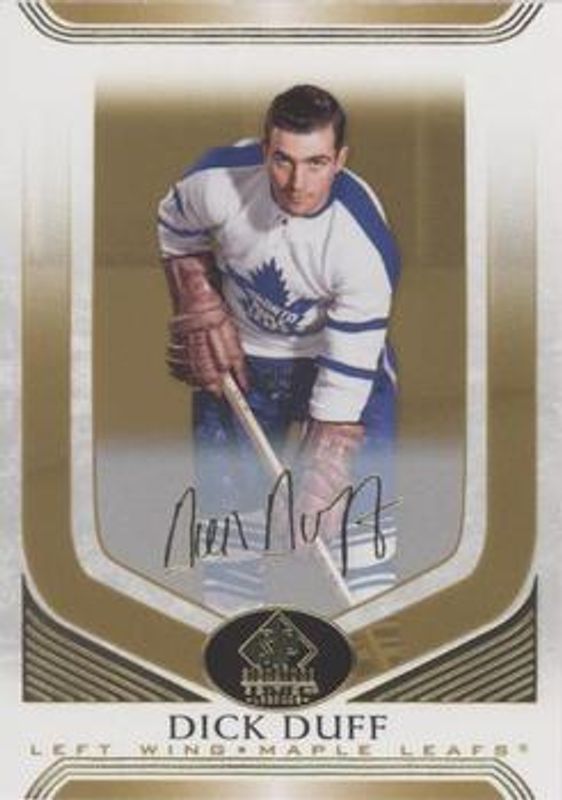 The Dick Duff 2020 SP Signature Edition Legends #99 Gold Foil card is 1 of 6 Dick Duff's card variations in the 2020 SP Signature Edition Legends set being tracked by Sports Card Investor, including Base /99, Gold Spectrum Foil Autographs /25, Black /10, 1997 Ultimate Legends The Alumni Signatures, and Silver Script.