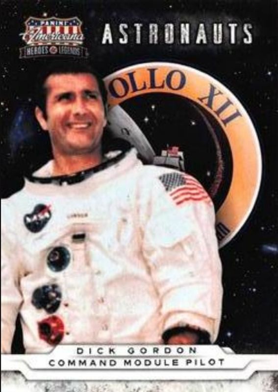 The Dick Gordon 2012 Panini Americana Heroes & Legends #6 Astronauts card is 1 of 15 Dick Gordon's card variations in the 2012 Panini Americana Heroes & Legends set being tracked by Sports Card Investor, including Base, Elite Color Photo /299, Elite Color Photo Materials /299, Elite Signatures /165, and Bronze Proof /100.