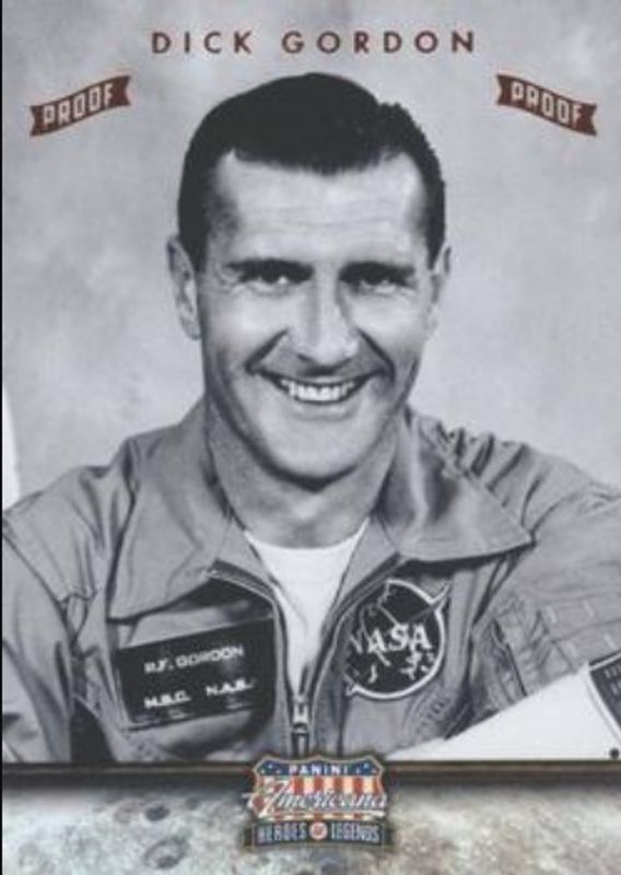 The Dick Gordon 2012 Panini Americana Heroes & Legends #82 Bronze Proof /100 card is 1 of 15 Dick Gordon's card variations in the 2012 Panini Americana Heroes & Legends set being tracked by Sports Card Investor, including Base, Elite Color Photo /299, Elite Color Photo Materials /299, Elite Signatures /165, and Elite Materials Bronze Proof /99.