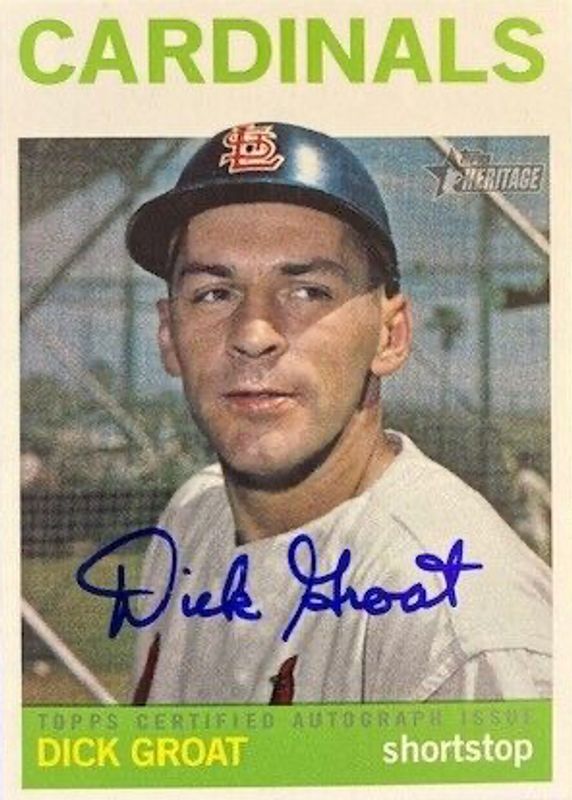 This card is 1 of 9 Dick Groat's card variations in the 2013 Topps Heritage set being tracked by Sports Card Investor, including 1964 Stamps Buyback, 1964 Tattoo Buyback, Real One Autographs - Red Ink /64, 1964 Mint - Nickel /15, and 1964 Mint - Dime /10.