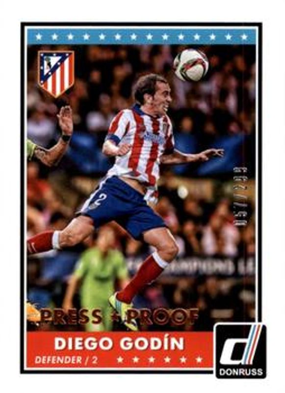 The Diego Godin 2015 Donruss #25 Bronze Press Proof /299 card is 1 of 16 Diego Godin's card variations in the 2015 Donruss set being tracked by Sports Card Investor, including Base, Silver Press Proof /199, Gold Press Proof /99, Red Soccer Ball /49, and Green Soccer Ball /25.