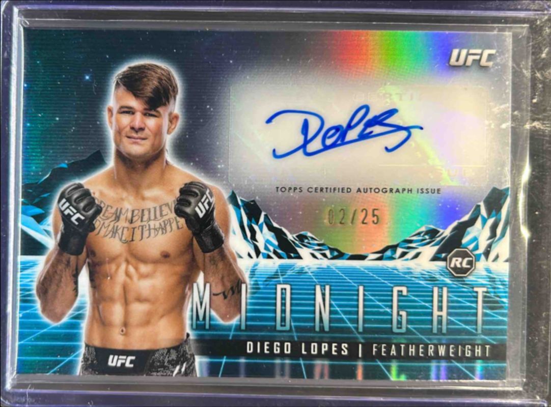 The Diego Lopes 2024 Topps Midnight UFC #HS-DLS Horizon Signatures - Moonrise /25 Rookie card is 1 of 19 Diego Lopes' card variations in the 2024 Topps Midnight UFC set being tracked by Sports Card Investor, including Base, Moon Beam, Morning /125, Twilight /99, and Dusk /75.