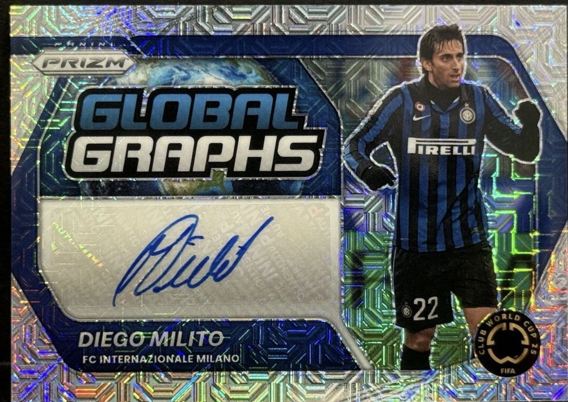 The Diego Milito 2025 Prizm Club World Cup #GG-DM Global Graphs - Mojo /4 card is 1 of 17 Diego Milito's card variations in the 2025 Prizm Club World Cup set being tracked by Sports Card Investor, including Global Graphs, Global Graphs - Blue Shimmer, Global Graphs - Velocity, Legendary Talents, and Legendary Talents - Silver.