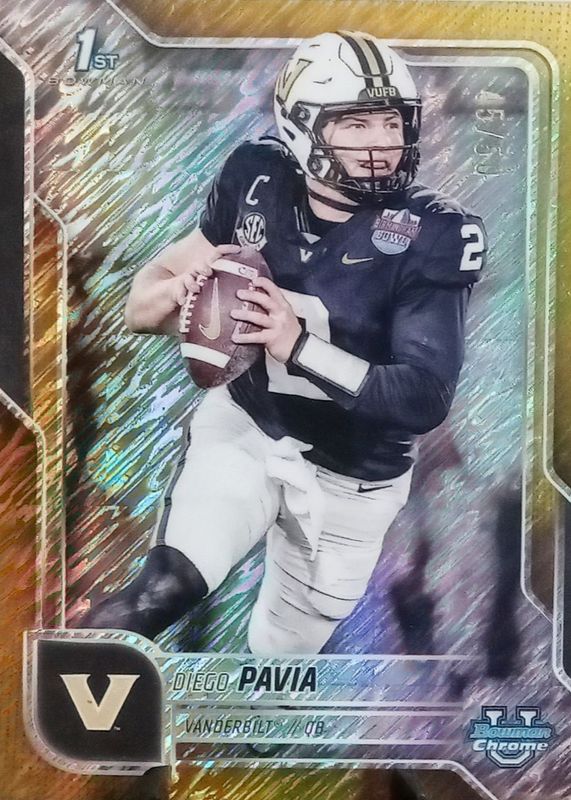 The Diego Pavia 2025 Bowman Chrome University #190 Gold Shimmer Refractor /50 (1st) card in Raw condition has moved up $11.01 (+28.2%) in the last 30 days and was last sold for $50.00 .