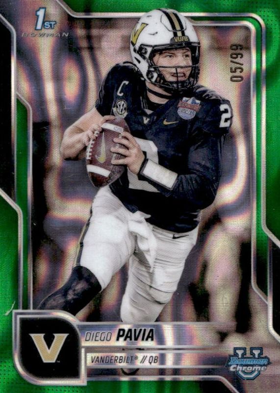 The Diego Pavia 2025 Bowman Chrome University #190 Green Lava Refractor /99 (1st) card in Raw condition has moved up $1.25 (+29.4%) in the last 30 days and was last sold for $5.50 .