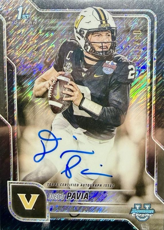 Best Prices Available For Sale of Diego Pavia 2025 Bowman Chrome University #BCA-DPA Prospect Auto - Black Shimmer Refractor /10 (1st)
