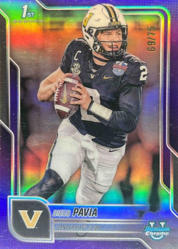 Best Prices Available For Sale of Diego Pavia 2025 Bowman Chrome University #190 Purple Refractor /75 (1st)