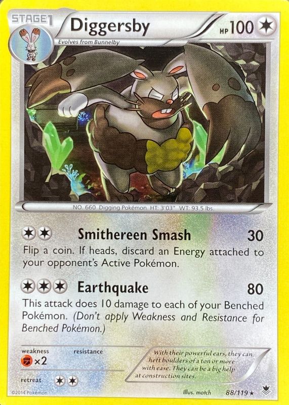 The Diggersby 2014 XY: Phantom Forces #088/119 Base card in Raw TCG (Lightly Played) condition has not changed in price in the last 30 days and was last sold for $0.99 .