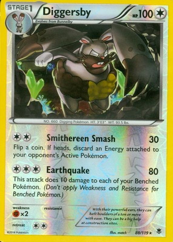 The Diggersby 2014 XY: Phantom Forces #088/119 Reverse Holo card in Raw TCG (Near Mint) condition has not changed in price in the last 30 days and was last sold for $1.45 .