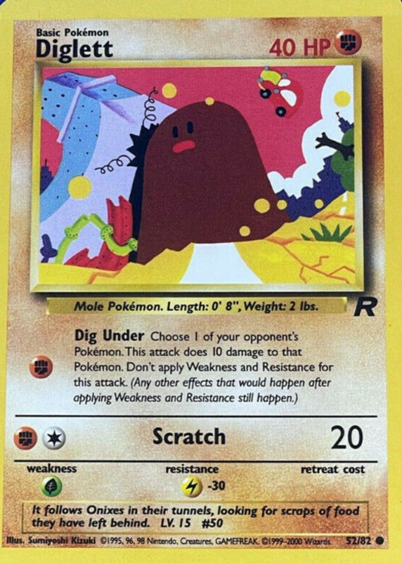 The Diglett 2000 Team Rocket #52/82 Unlimited card in Raw TCG (Near Mint) condition has moved up $0.51 (+51.5%) in the last 30 days and was last sold for $1.50 .