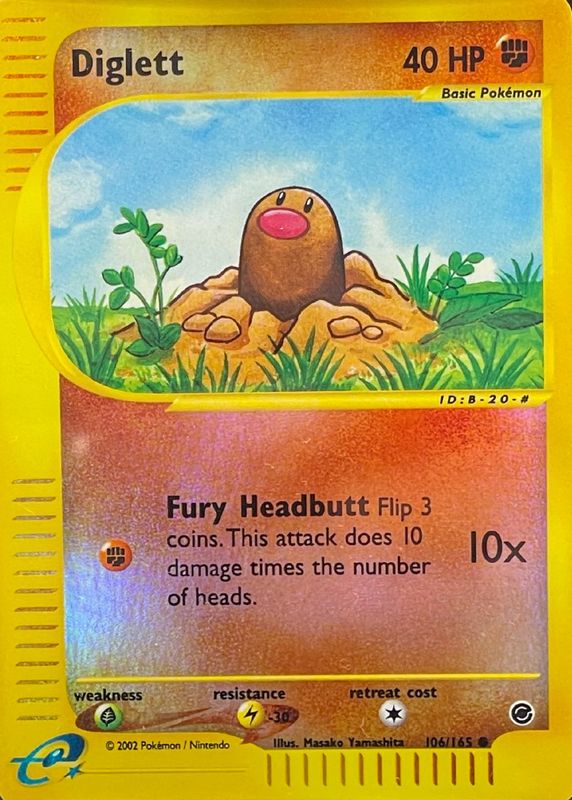 The Diglett 2002 Expedition #106/165 Reverse Holo card in Raw TCG (Near Mint) condition has moved up $1.55 (+15.1%) in the last 30 days and was last sold for $11.82 .