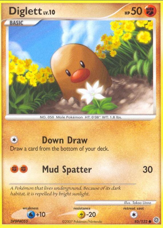 The Diglett 2007 Diamond & Pearl: Secret Wonders #085/132 Base card in Raw TCG (Lightly Played) condition has moved up $1.68 (+170%) in the last 30 days and was last sold for $2.67 .