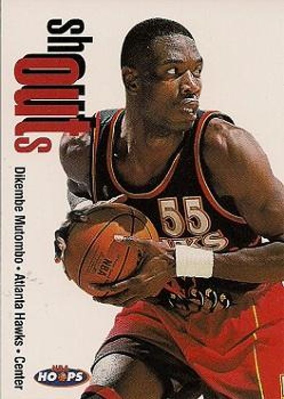 The Dikembe Mutombo 1998 Hoops #20-SO Shout Outs card is 1 of 5 Dikembe Mutombo's card variations in the 1998 Hoops set being tracked by Sports Card Investor, including Base, Starting Five /5, Autographics, and Rejectors /2500.
