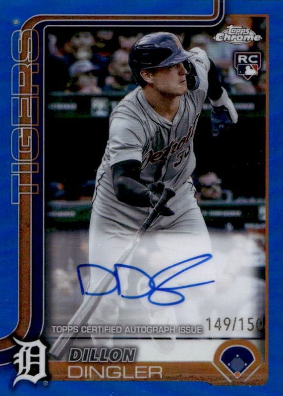 The Dillon Dingler 2025 Topps Chrome #RA-DD Rookie Autographs - Blue Refractor /150 card in Raw condition has moved up $12.00 (+30.0%) in the last 30 days and was last sold for $52.00 .