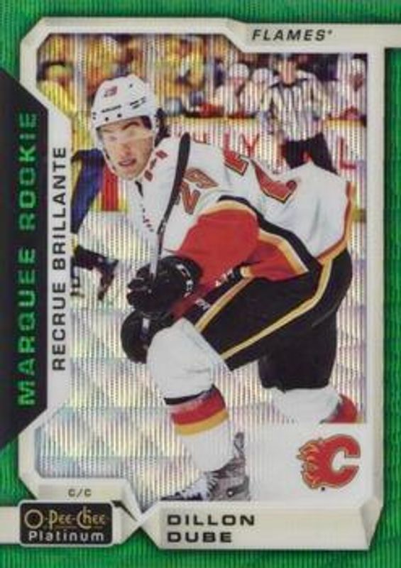The Dillon Dube 2018 O-Pee-Chee Platinum #156 Emerald Surge /10 Rookie card is 1 of 22 Dillon Dube's card variations in the 2018 O-Pee-Chee Platinum set being tracked by Sports Card Investor, including Base, Rainbow, Violet Pixels, Red Prism /199, and Arctic Freeze /79.