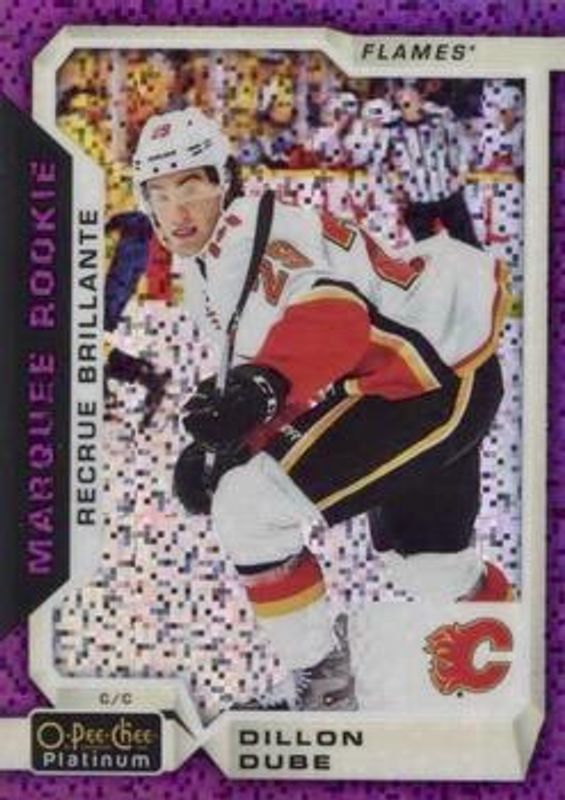 The Dillon Dube 2018 O-Pee-Chee Platinum #156 Violet Pixels Rookie card is 1 of 22 Dillon Dube's card variations in the 2018 O-Pee-Chee Platinum set being tracked by Sports Card Investor, including Base, Rainbow, Red Prism /199, Arctic Freeze /79, and Seismic Gold /50.