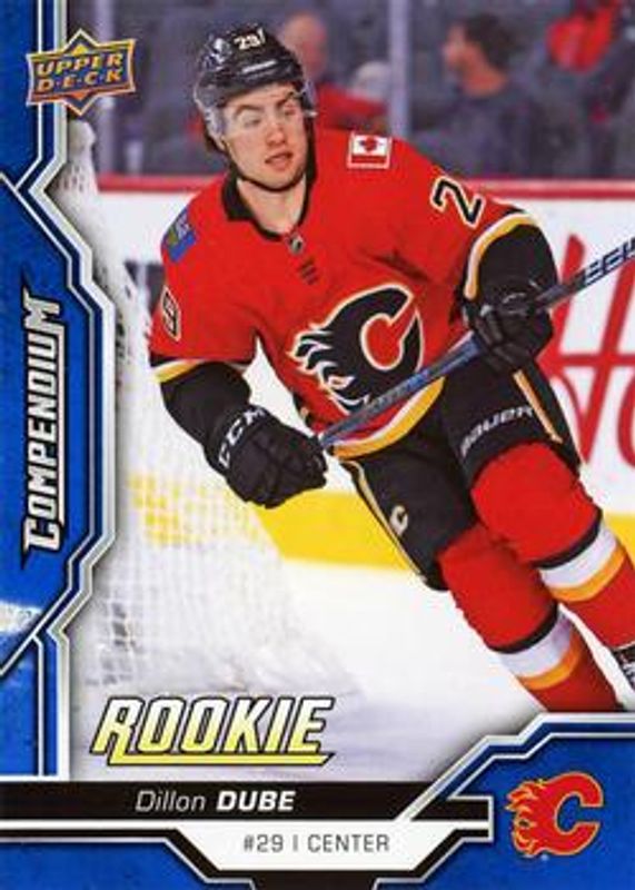 The Dillon Dube 2018 Upper Deck Compendium #804 Blue Rookie card is 1 of 6 Dillon Dube's card variations in the 2018 Upper Deck Compendium set being tracked by Sports Card Investor, including Gold, Printing Plates Black /1, Printing Plates Cyan /1, Printing Plates Magenta /1, and Printing Plates Yellow /1.