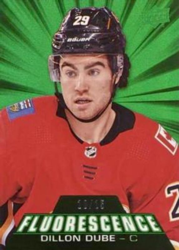 The Dillon Dube 2018 Upper Deck #F-17 Fluorescence - Green /15 Rookie card is 1 of 28 Dillon Dube's card variations in the 2018 Upper Deck set being tracked by Sports Card Investor, including Young Guns Base, Young Guns Canvas, Young Guns - Clear Cut, Young Guns - Jumbo, and Young Guns - Silver Foil.