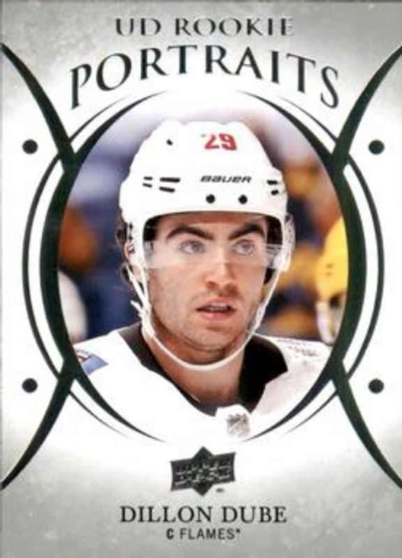 The Dillon Dube 2018 Upper Deck #P-89 UD Portraits Rookie card is 1 of 28 Dillon Dube's card variations in the 2018 Upper Deck set being tracked by Sports Card Investor, including Young Guns Base, Young Guns Canvas, Young Guns - Clear Cut, Young Guns - Jumbo, and Young Guns - Silver Foil.