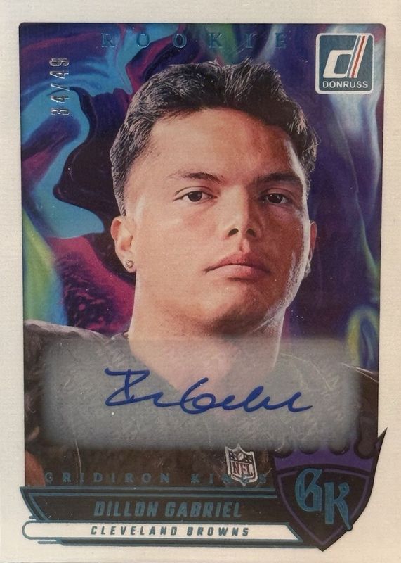 The Dillon Gabriel 2025 Donruss #RGK-DGL Rookie Gridiron Kings Autographs (/49) card in Raw condition has not changed in price in the last 30 days and was last sold for $90.00 .