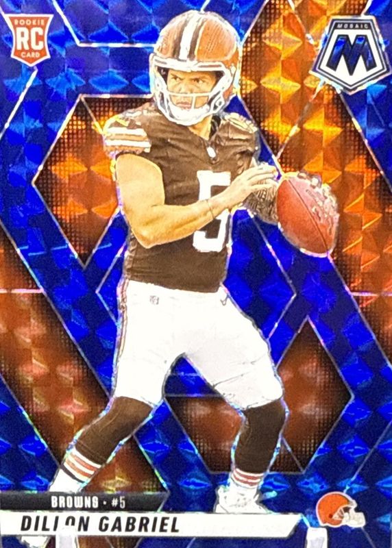 The Dillon Gabriel 2025 Mosaic #332 Blue /99 Rookie card in Raw condition has not changed in price in the last 30 days and was last sold for $5.50 .