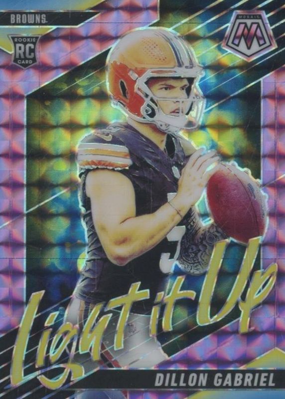 The Dillon Gabriel 2025 Mosaic #21 Light It Up - Purple /49 Rookie card in Raw condition has moved up $0.01 (+0.2%) in the last 30 days and was last sold for $5.51 .