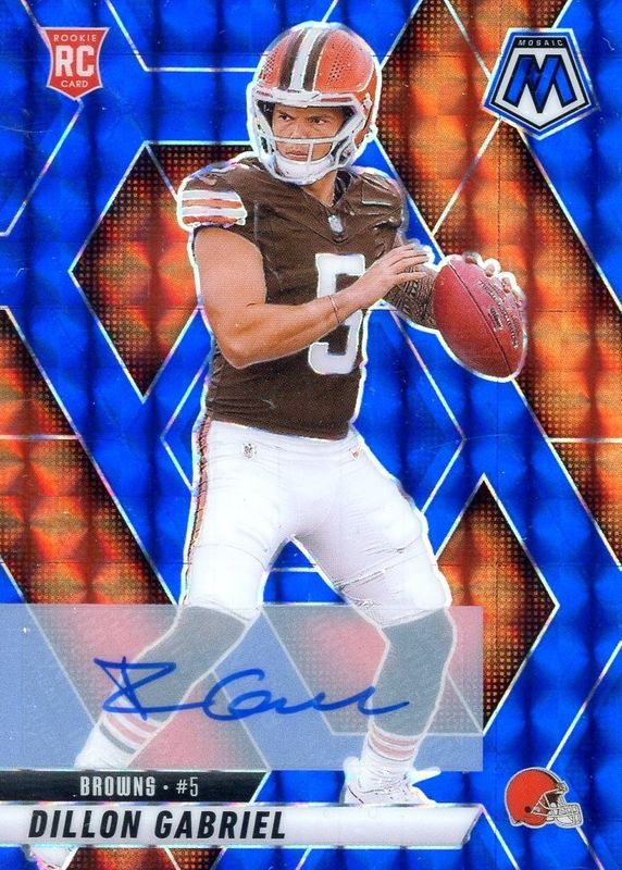 The Dillon Gabriel 2025 Mosaic #332 Rookie Autographs - Blue /99 card in Raw condition has moved down -$13.00 (-37.1%) in the last 30 days and was last sold for $22.00 .