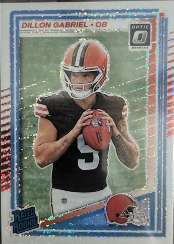 The Dillon Gabriel 2025 Optic #263 White Sparkle /(SSP) Rookie card in Raw condition has moved down -$3.50 (-26.9%) in the last 30 days and was last sold for $9.50 .