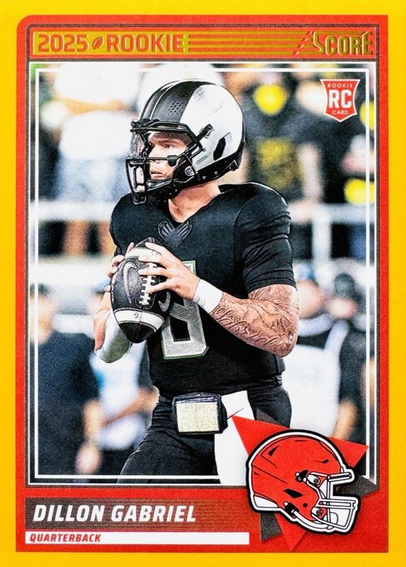 The Dillon Gabriel 2025 Score #41 Gold Rookie card in Raw condition has moved up $5.35 (+324%) in the last 30 days and was last sold for $7.00 .