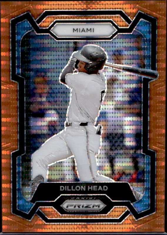 The Dillon Head 2024 Prizm #79 Orange Pulsar /399 card is 1 of 38 Dillon Head's card variations in the 2024 Prizm set being tracked by Sports Card Investor, including Base, Blue Ice, Green, Green Ice, and Pink Ice.